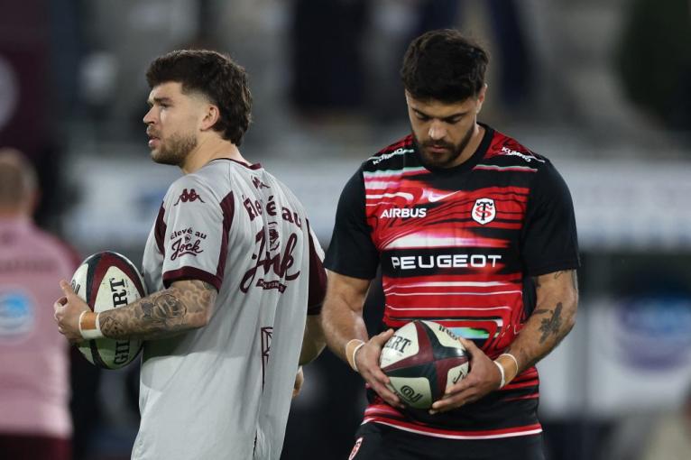 Bordeaux’ French fly half Matthieu Jalibert (l) and Toulouse’ French fly half Romain Ntamack react during the warm-up before the French rugby union Top14 match between Union Bordeaux-Begles (UBB) and Toulouse at the Stade Atlantique Bordeaux Metropole in Bordeaux, southwest of 26 IN Photo by PERROCHEAU / AFP via Getty Images)